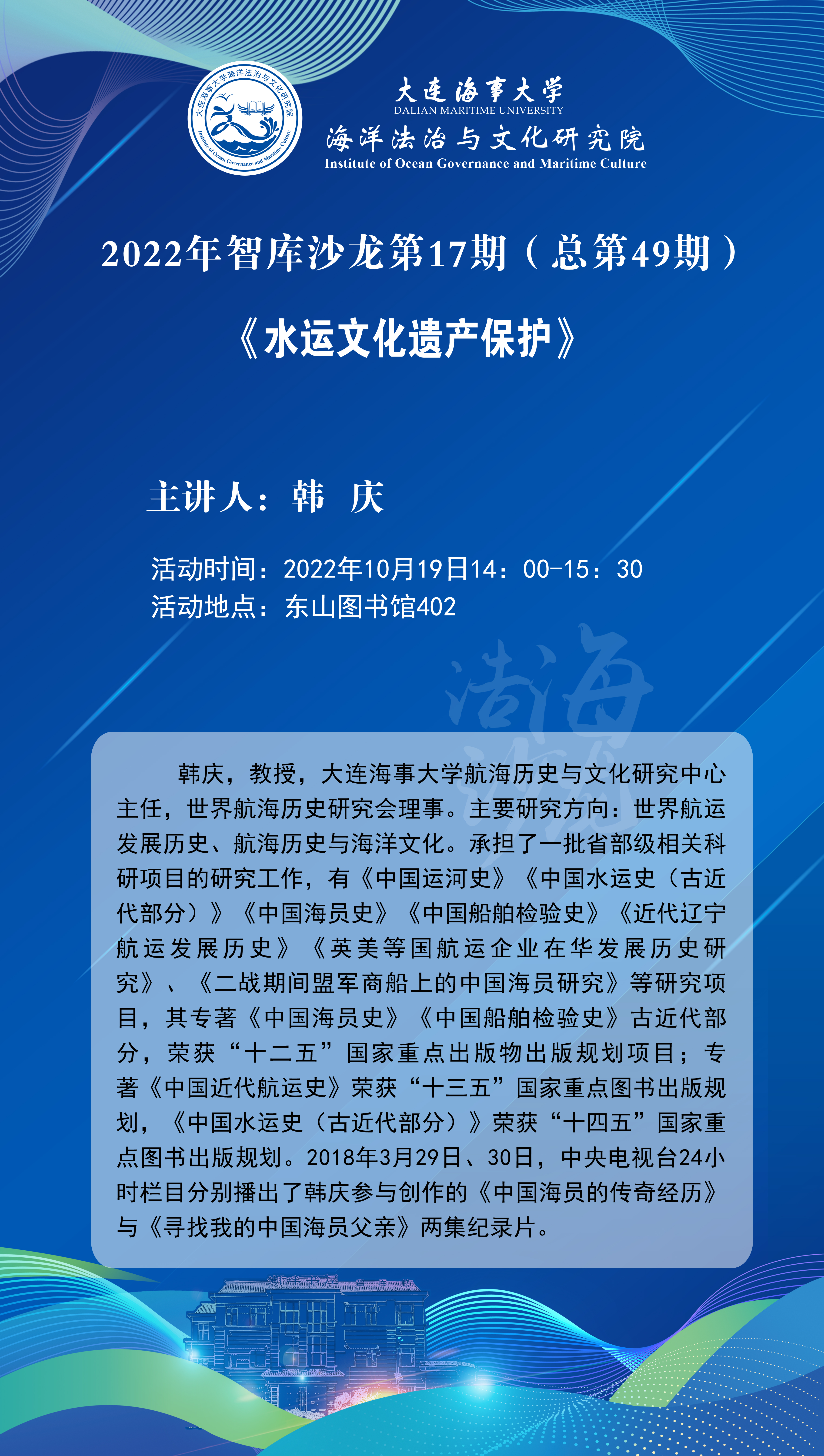 韩庆,教授,世俱杯sjb官网航海历史与文化研究中心主任,世界航海历史研究会理事。主要研究方向:世界航运发展历史、航海历史与海洋文化。承担了一批省部级相关科研项目的研究工作,有《中国运河史》《中国水运史(古近代部分)》《中国海员史》《中国船舶检验史》《近代辽宁航运发展历史》《英美等国航运企业在华发展历史研究》、《二战期间盟军商船上的中国海员研究》等研究项目,其专著《中国海员史》《中国船舶检验史》古近代部分,荣获“十二五”国家重点出版物出版规划项目;专著《中国近代航运史》荣获“十三五”国家重点图书出版规划,《中国水运史(古近代部分)》荣获“十四五”国家重点图书出版规划。2018年3月29日、30日,中央电视台24小时栏目分别播出了韩庆参与创作的《中国海员的传奇经历》与《寻找我的中国海员父亲》两集纪录片。