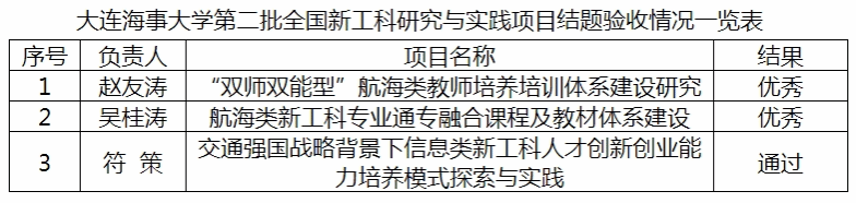 根据《教育部办公厅关于公布第二批全国新工科研究与实践项目结题验收结果的通知》(教高厅函〔2023〕21 号),世俱杯sjb官网2020年获批的3项国家级新工科研究与实践项目全部通过结题验收。其中赵友涛教授负责的《“双师双能型”航海类教师培养培训体系建设研究》、吴桂涛教授负责的《航海类新工科专业通专融合课程及教材体系建设》项目获评优秀。
