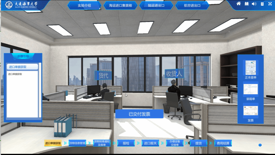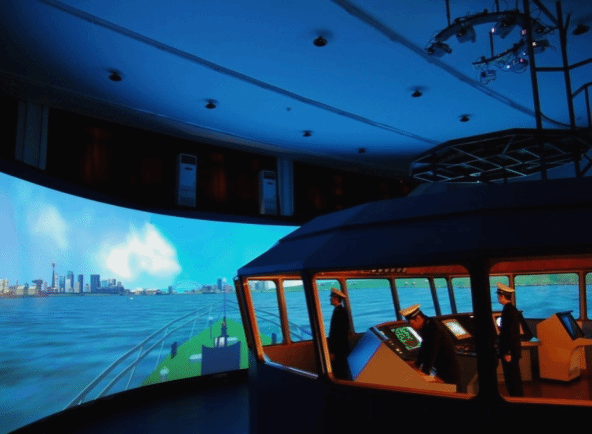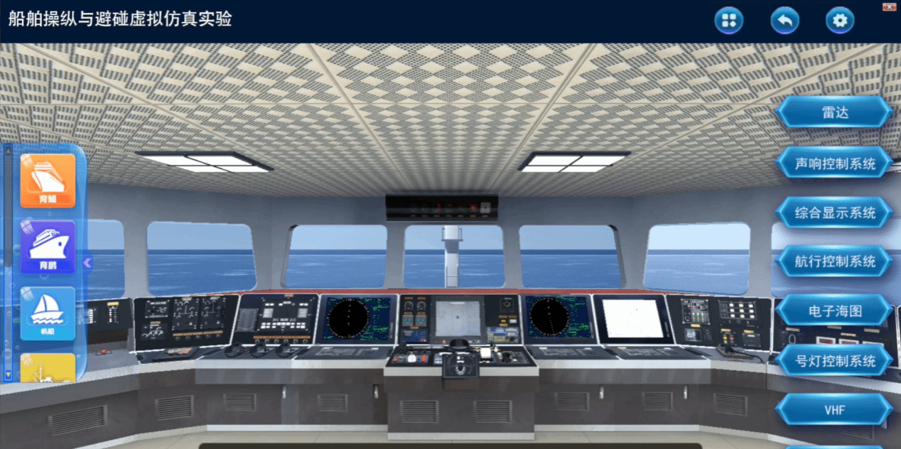 实验室在综合运用雷达、电子海图、车钟、舵等船用导助航设备的基础上,创建了以育鲲轮、育鹏轮为代表船型的海上通航虚拟场景,运用三维建模仿真技术手段,高度还原了船舶海上航行过程中的多种会遇态势。允许船员可以在多种情况下进行训练,提高他们的技能,使实验场景和实验对象更直观形象。