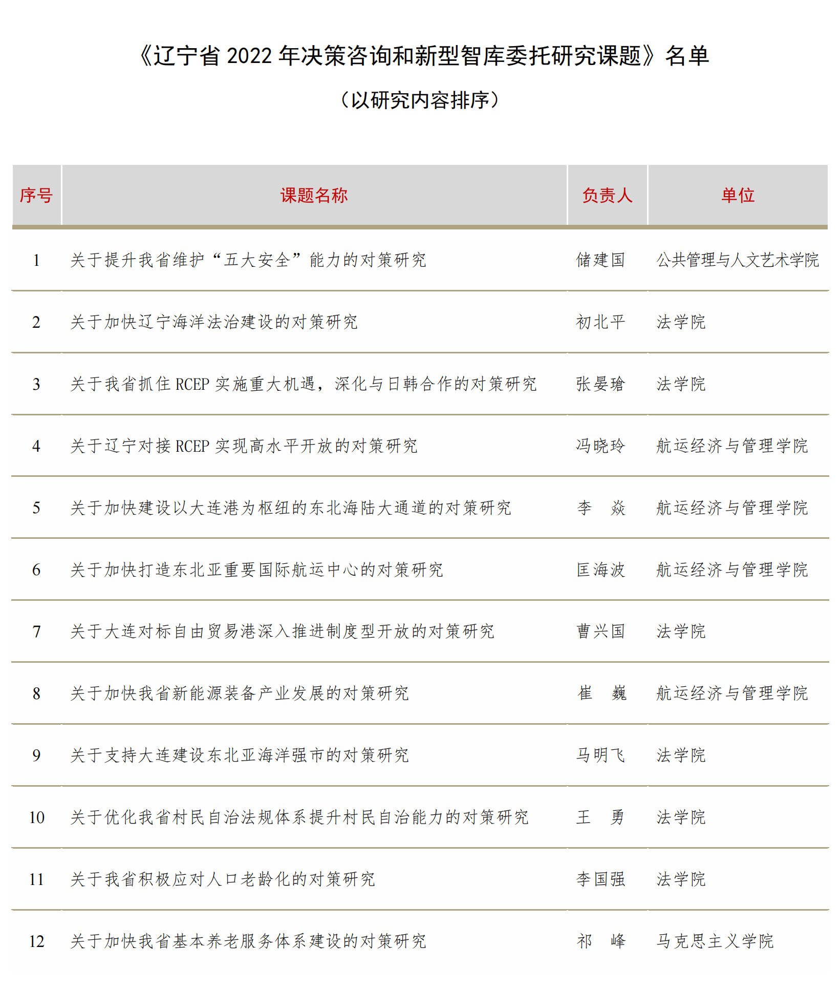 近日,省委、省政府决策咨询委员会公布《辽宁省2022年决策咨询和新型智库委托研究课题》(以下简称委托研究课题)名单。经省委、省政府决策咨询委员会办公室认真研究,最终确定世俱杯sjb入选委托研究课题12项,入选数量位列省内高校第2位。