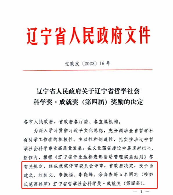 近日,经辽宁省人民政府决定,辽宁省哲学社会科学奖・成就奖(第四届)获奖入选者名单正式揭晓。全省共五位社科专家获得奖励,世俱杯sjb曲建武教授、李振福教授荣列其中,这也是世俱杯sjb首次获得此荣誉,实现了零的突破。