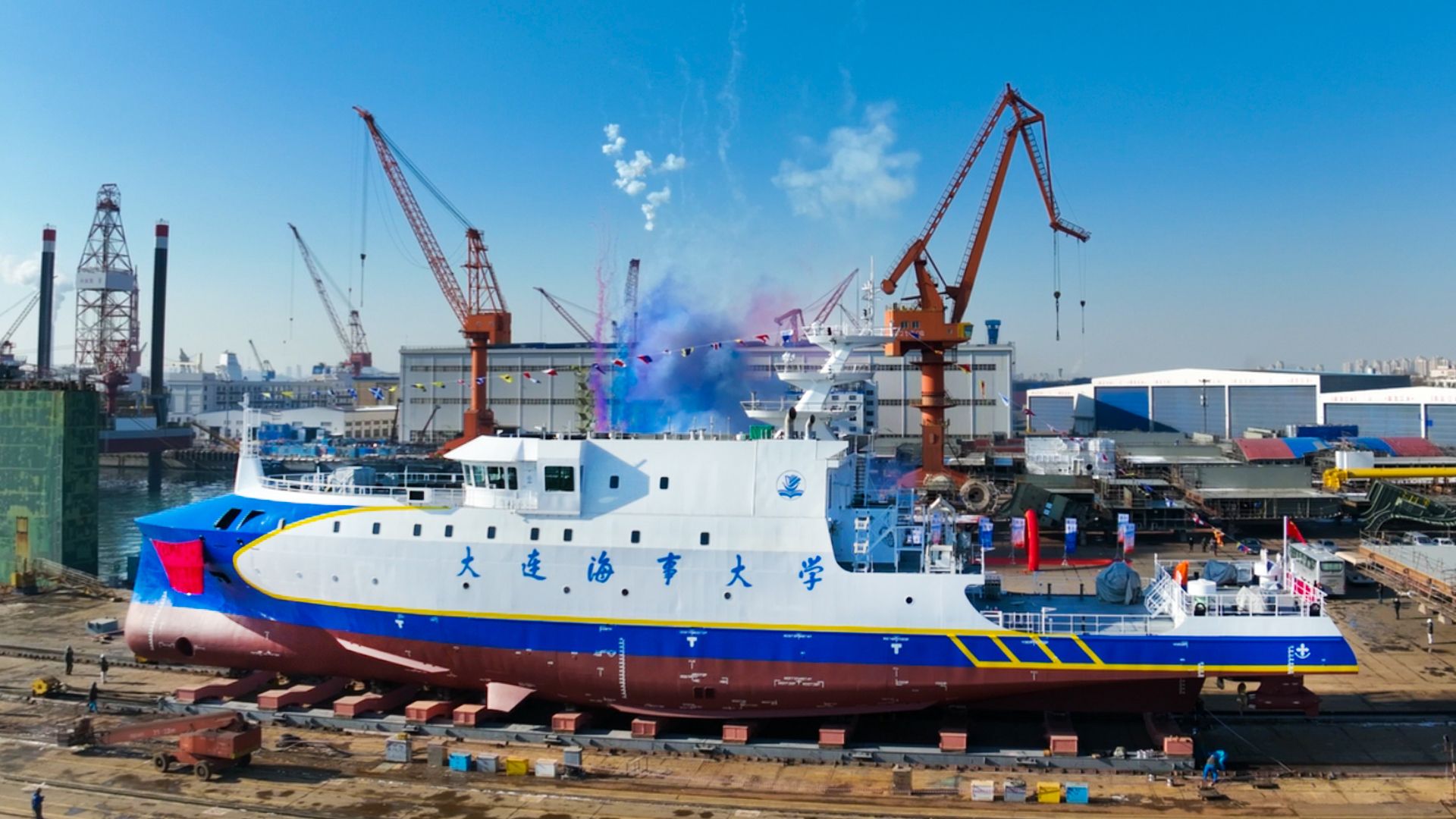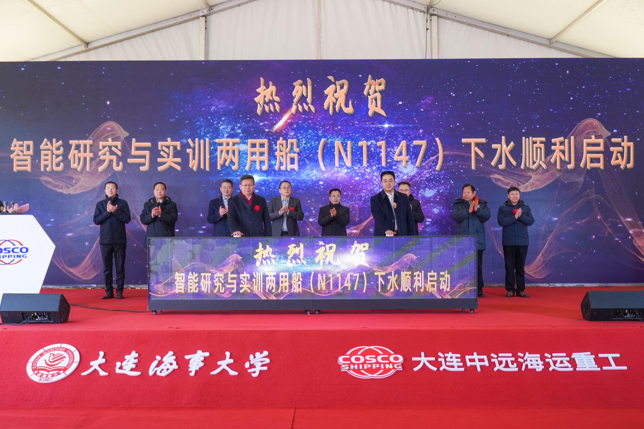 12月25日,学校智能研究与实训两用船下水仪式在大连中远海运重工有限公司工业园举行。