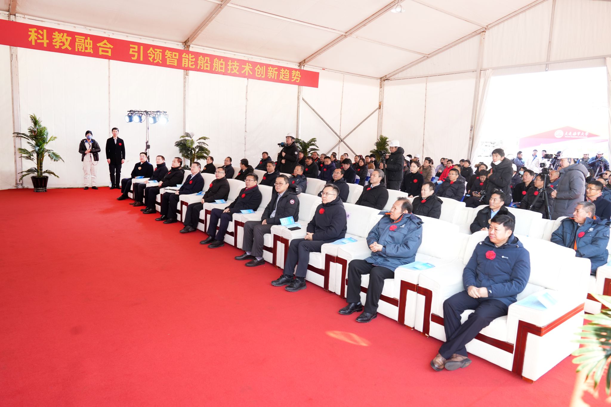 学校党政办公室,纪委办公室(审计处),党委宣传部,党委学生工作部,党委教师工作部、人事处,党委人才办公室,教务处,科技处,研究生院,发展规划与质量管理处,国有资产与实验室管理处,财务处,航海学院,轮机工程学院,船舶电气工程学院等单位和部门相关负责同志以及大连海大国际船舶管理有限公司负责同志,无人船协同创新研究院教师代表,监造组代表出席了仪式。