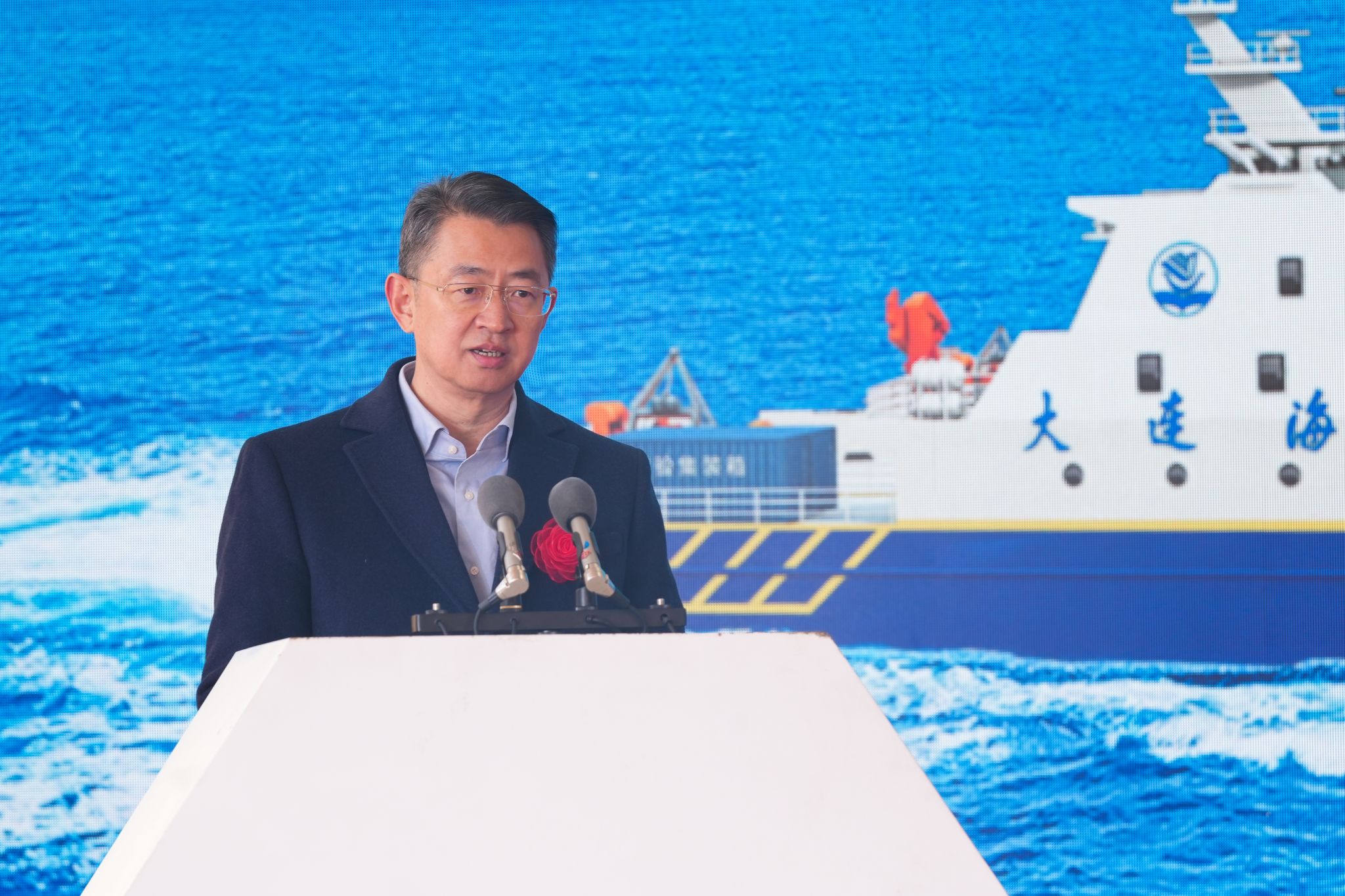 单红军在致辞中,向财政部大连监管局、辽宁海事局、中国船级社大连分社、中远海运重工有限公司、上海船舶设计研究院对“两用船”建造以及对学校事业发展的鼎力支持表示感谢。他从学校第一艘实习船“红专轮”回顾了60年来学校实习船从无到有,从有到优,从科技化到智能化的发展历程。他表示,“两用船”的建造在海大历史上有着承前启后,继往开来的特殊意义,承载着海大顺应智能船舶和智能航运发展趋势,奋力加快建设交通强国和海洋强国的光荣使命。未来,“两用船”投入使用后,学校将着力打造“两个平台”,一是与行业企业一道,深入推进科教融合、校企协同,把“两用船”打造成新一代智能船舶技术应用与综合试验的高端平台,以促进智能船舶开发运用和装备研制水平的提升,为我国智能船舶发展提供技术支撑;二是把“两用船”打造成智能航运高端人才培养平台,使学生能够直接感知最先进的智能船用设备、系统和技术,为探索创新未来航海人才的培养模式提供实践基础,努力引领智能时代航运人才培养模式创新。