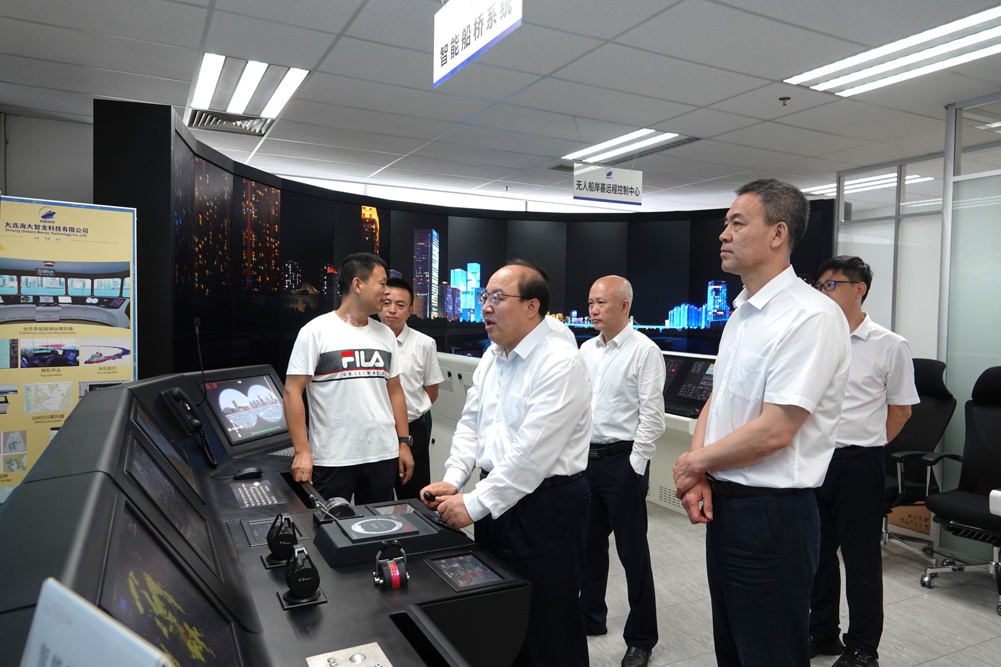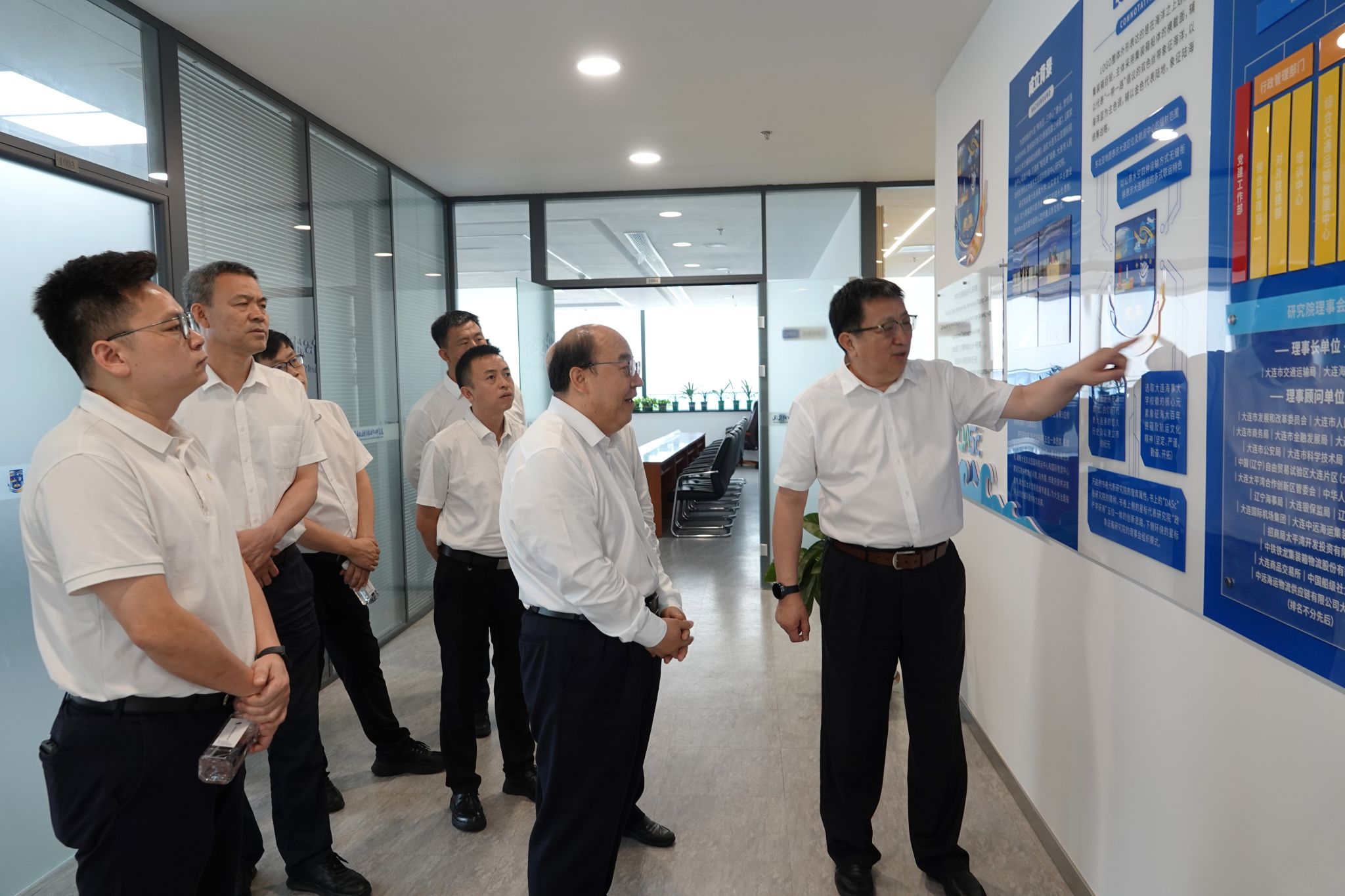 座谈会后,宫辉一行在赵宝刚的陪同下现场考察了大连海大智龙科技有限公司、大连东北亚国际航运中心研究院和海大展馆。