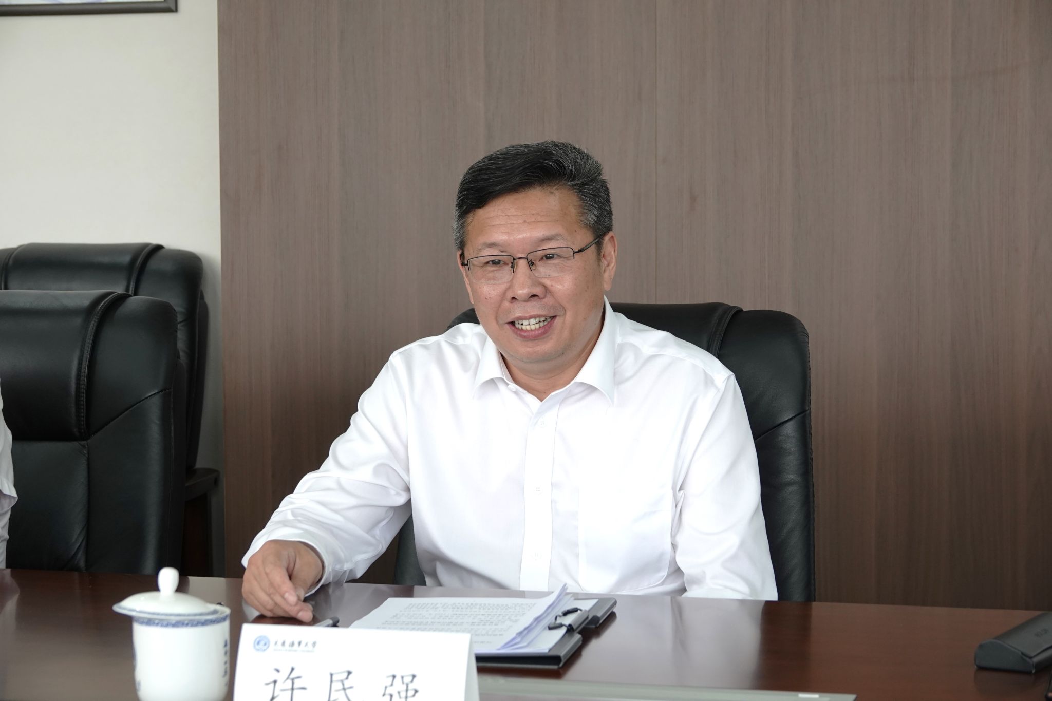 许民强代表学校对宫辉一行的到来表示热烈欢迎,他简要介绍了学校的发展历程并表示,重庆交通大学与海大根脉相连、使命相通,希望两校以本次调研交流为新起点,携手并肩,扎实推进各领域务实合作,共同为加快建设交通强国贡献力量。