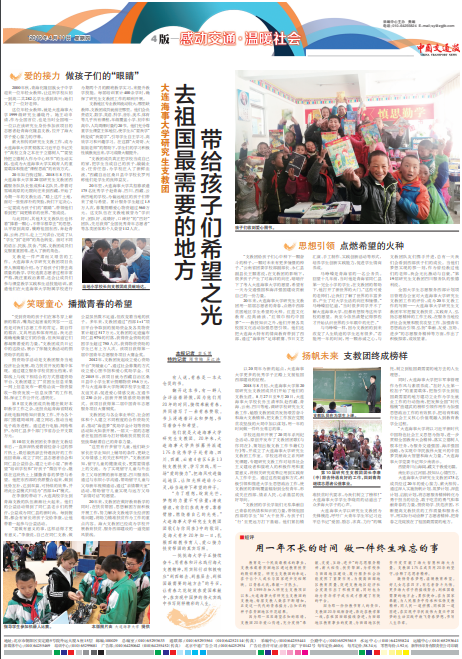 世俱杯sjb官网研究生支教团175名成员经过20年的爱心接力、薪火相传,通过深入实施扬帆计划、筑梦计划、深蓝计划、启航计划,将志愿服务精神转化为勇于担当的信念、敢于吃苦的勇气和奉献青春的力量,捐资助学、扶危济困,不断提高支教扶贫的工作质量和服务水平,用实际行动诠释了志愿者精神,让青春之花绽放在了祖国最需要的地方。
