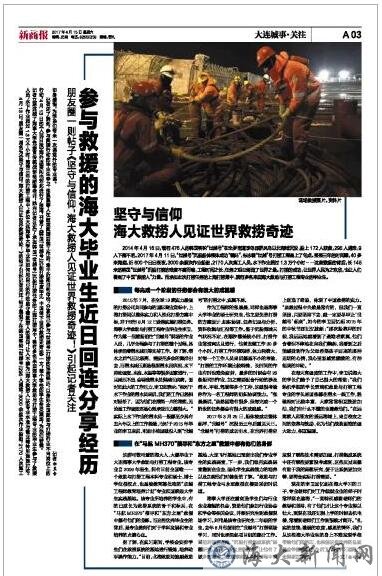 记者还了解到,参与救援行动的毕业生李卫、张晨晨等人在结束救援后续工作后,将于近期回到母校,分享自己参与“世越号”打捞的宝贵经历,以身处全国救助与打捞行业不同岗位上的切身感悟,为学弟们带来一次课堂外的专业课。记者初昱含坚守与信仰