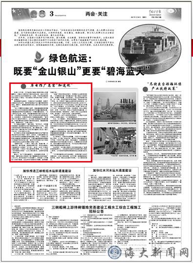 全国人大代表、江苏省连云港港口集团有限公司原董事长、总裁白力群告诉中国水运报记者,他在今年两会上也很关注生态环境保护这一主题,并在两会期间再次向全国人大提出“在全国加大岸电技术推广应用力度”的建议。