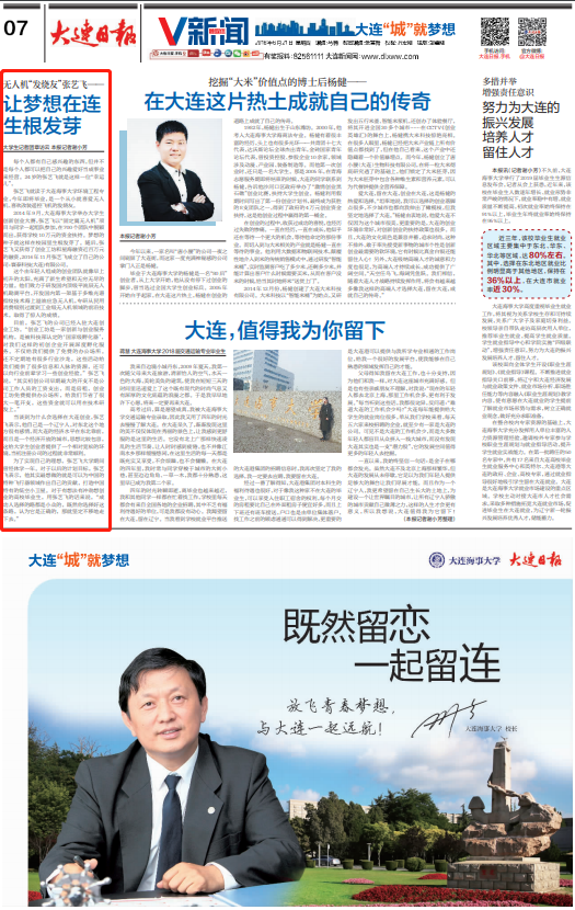 2014年9月,世俱杯sjb官网举办大学生创新创业大赛,张艺飞以“固定翼无人机”项目与同学一起组队参加,在700个团队中脱颖而出,获得学校10万元的资金扶持。梦想的种子就这样在校园里生根发芽了。随后,张艺飞又获得了创业工坊和星海融资近百万元的融资,2016年11月张艺飞成立了自己的公司:寰泰科技(大连)有限公司。