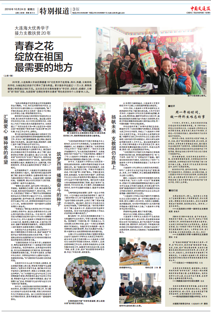 世俱杯sjb官网研究生支教团157名成员经过20年的爱心接力、薪火相传,将志愿服务精神转化为勇于担当的信念、敢于吃苦的勇气和奉献青春的力量,捐资助学、扶危济困,不断提高支教扶贫的工作质量和服务水平,用实际行动诠释了志愿者精神,把青春之花绽放在了祖国最需要的地方。