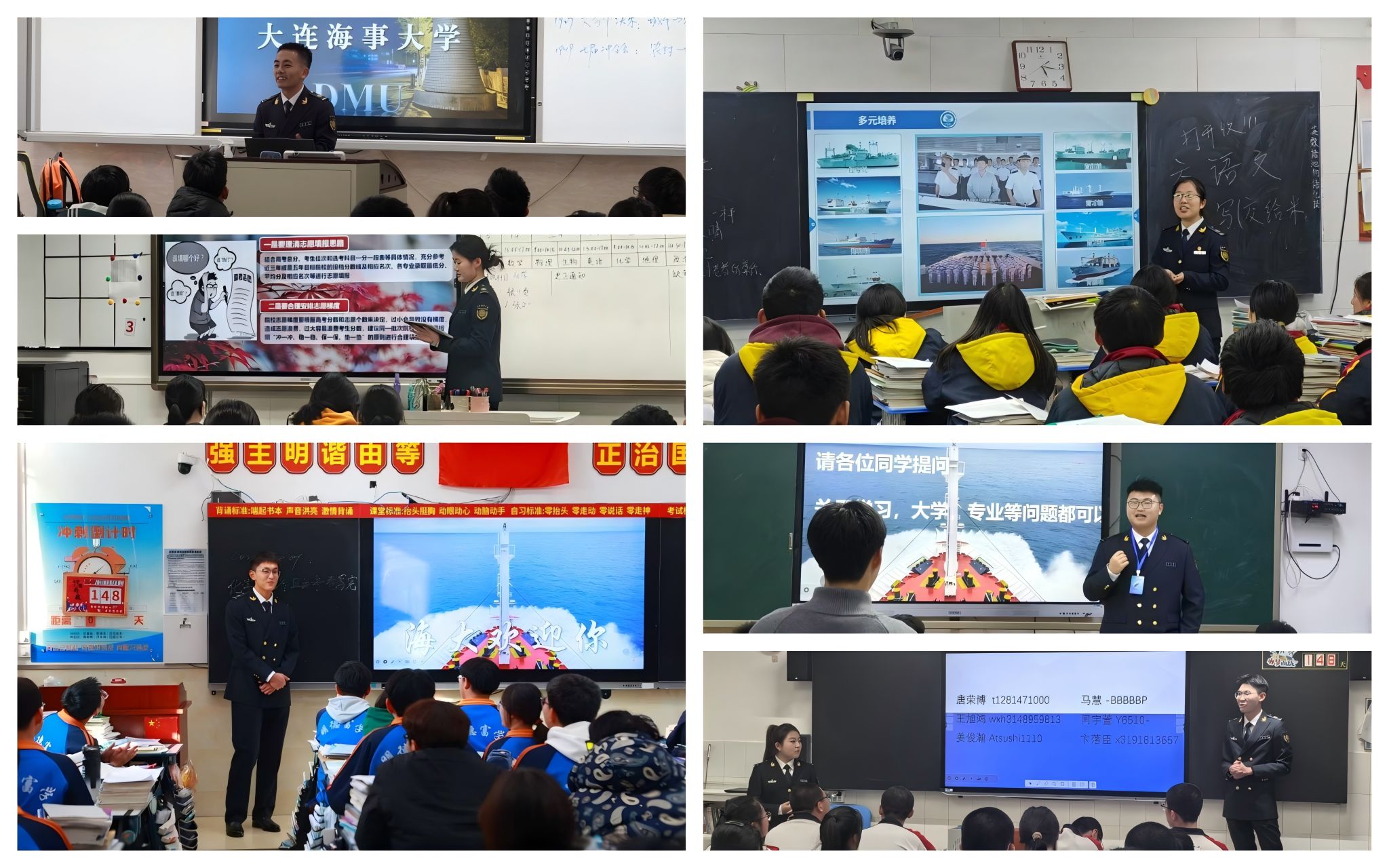 来自船舶与海洋工程学院的“追求卓越”团队以母校北票市高级中学为宣传阵地,构建“沉浸体验+陪伴指导”宣传模式,向高中学生及家长展现海大风貌:从“百年学府底蕴”到“特色学科优势”,从“多彩校园生活”到“广阔就业前景”,团队通过精心制作宣传材料和视频展示世俱杯sjb办学特色,同时聚焦船舶与海洋工程学科,将海事相关学科专业知识科普与“海洋强国战略”历史使命、学校“双一流”建设及半军事管理等特色相结合,在高中母校产生了积极热烈的反响。实践中,他们坚持“即时解答+长期互动”相结合的形式,除了实践现场答疑解惑外,还建立微信群、QQ群,与高中学子和家长建立长期联系,鼓励母校优秀学子积极报考海大。