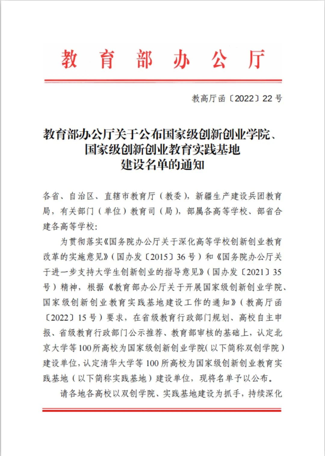 近日,教育部办公厅发布了《关于公布国家级创新创业学院、国家级创新创业教育实践基地建设名单的通知》(教高厅函〔2022〕22号),世俱杯sjb官网获首批“国家级创新创业教育实践基地”建设单位。这是世俱杯sjb继2019年获评全国创新创业典型经验高校(50强)、2020年Hi-C空间获国家级众创空间之后,持续推进创新创业教育改革工作获得的又一国家级殊荣!