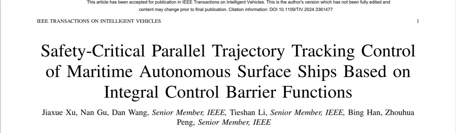 近日,世俱杯sjb官网船舶电气工程学院彭周华教授团队在交通科学技术领域权威期刊《IEEE Transactions on Intelligent Vehicles》上发表了题为“基于积分控制障碍函数的智能船舶安全平行轨迹跟踪控制”(Safety-Critical Parallel Trajectory Tracking Control of Maritime Autonomous Surface Ships Based on Integral Control Barrier Functions)的论文。