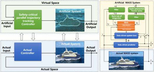 创新点如下:第一,与现有基于物理方程或数据统计的船舶运动建模方式不同,将物理方程和历史数据同时融入到船舶运动数字孪生运动建模,构建了数据驱动智能预估器,实现了船舶信息空间和物理空间船舶模型信息的精确状态同步和模型在线演化,为态势推演和平行控制提供了精确的船舶模型信息和风浪流干扰信息。第二,与现有基于代数方程描述的船舶运动控制器不同,提出了基于积分控制障碍函数的安全平行自学习抗干扰轨迹跟踪动态控制律,不仅保证了航行过程中的稳定性和抗扰性,而且保障了船舶在复杂交通场景下航行过程中的安全性。综上,与现有船舶运动控制理论不同,该文提出的新型实时运动数字孪生建模和平行控制策略为智能船舶运动控制提供了新途径,在智能船舶船岸协同、自主航行、自主靠泊、编队航行等作业场景具有重要应用前景,对于新一代绿色、智慧、安全航运系统的构建具有积极意义。