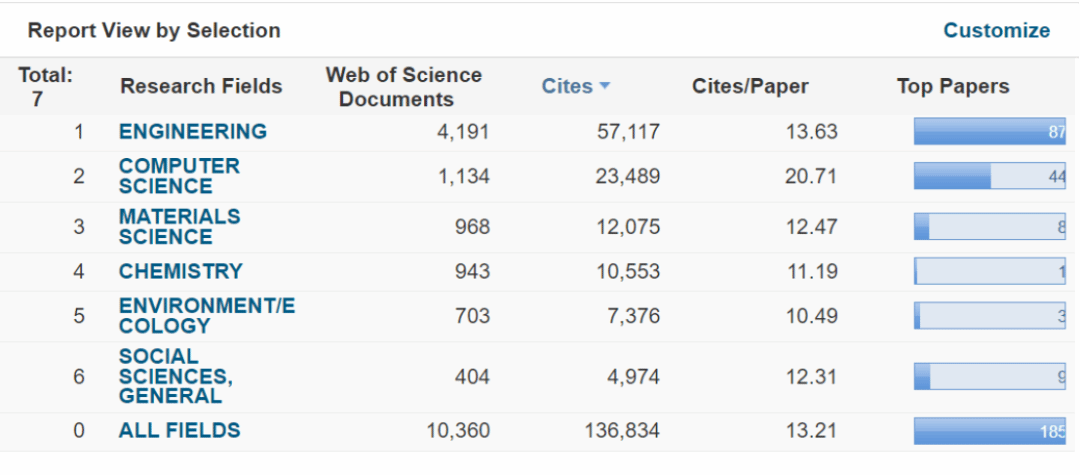 ESI作为基于Web of Science核心合集的深度分析型研究工具,对SCIE/SSCI 收录的全球12000多种期刊论文发表数量和引文数据进行统计,提供对22个学科研究领域中的国家、机构、期刊的科研绩效统计和科研实力排名。ESI是当今世界范围内评价学术机构和大学的国际学术水平及影响力的较为常用的重要指标之一。