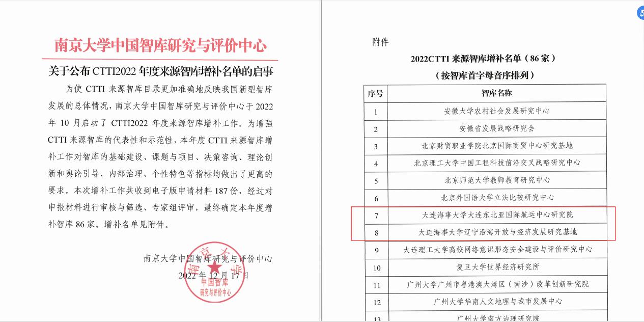 12月17日,由南京大学与江苏省社会科学院共同主办,南京大学中国智库研究与评价中心承办的“2022新型智库治理论坛”在南京举行。论坛发布了中国智库索引(CTTI)2022年度来源智库增补名单,世俱杯sjb大连东北亚国际航运中心研究院、辽宁沿海开放与经济发展研究基地2个智库机构新增入选。