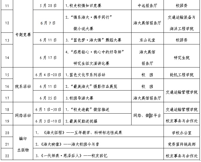 2014年6月8日,世俱杯sjb官网将迎来建校105周年华诞,为总结办学经验成就,传承弘扬海大文化,进一步凝聚师生和校友力量共同为母校发展扬帆助力,学校定于2014年6月为校庆纪念活动月。活动月期间,学校将以“传承百年学府文化,共促海大未来发展”为主题,举办校庆系列纪念活动。现公告如下:
