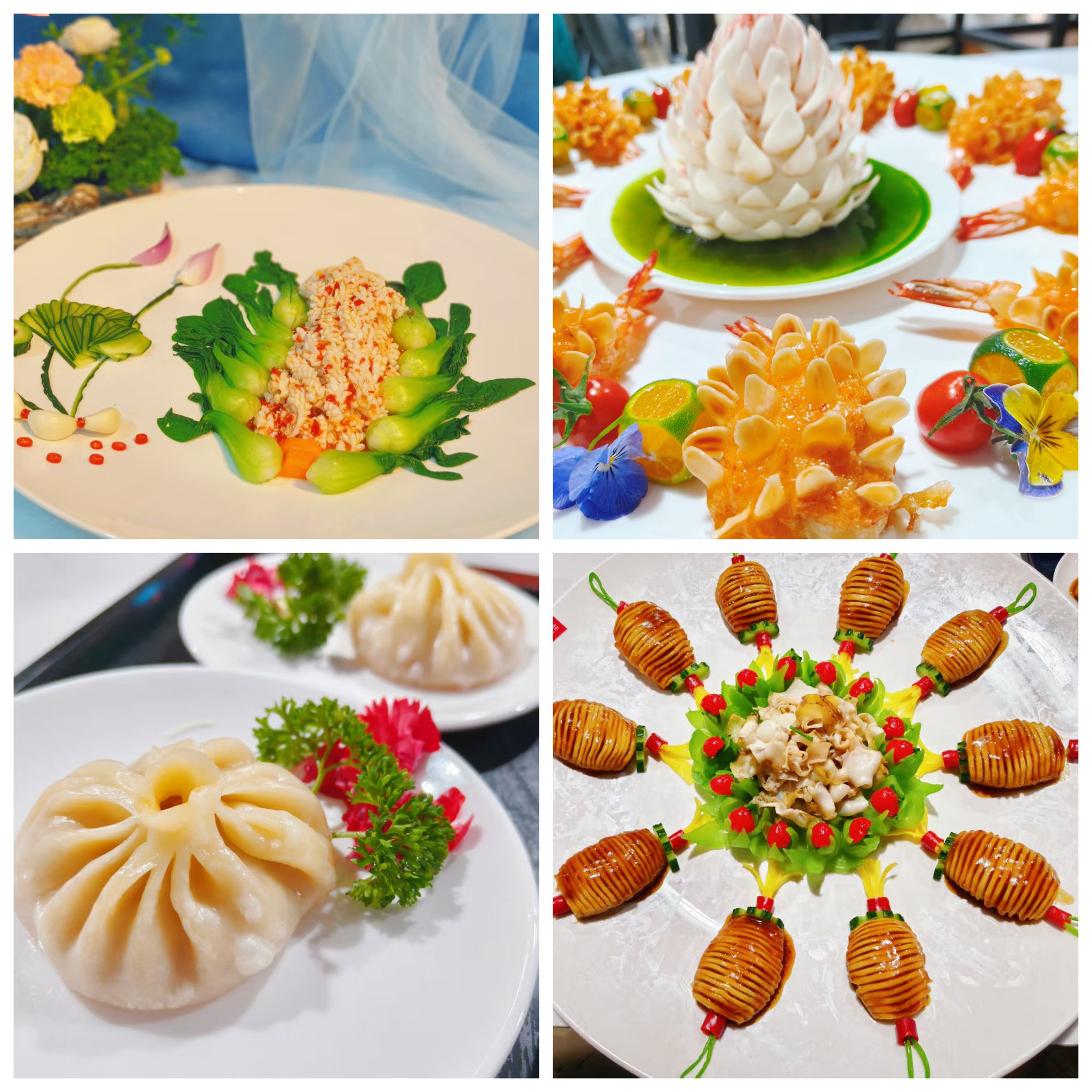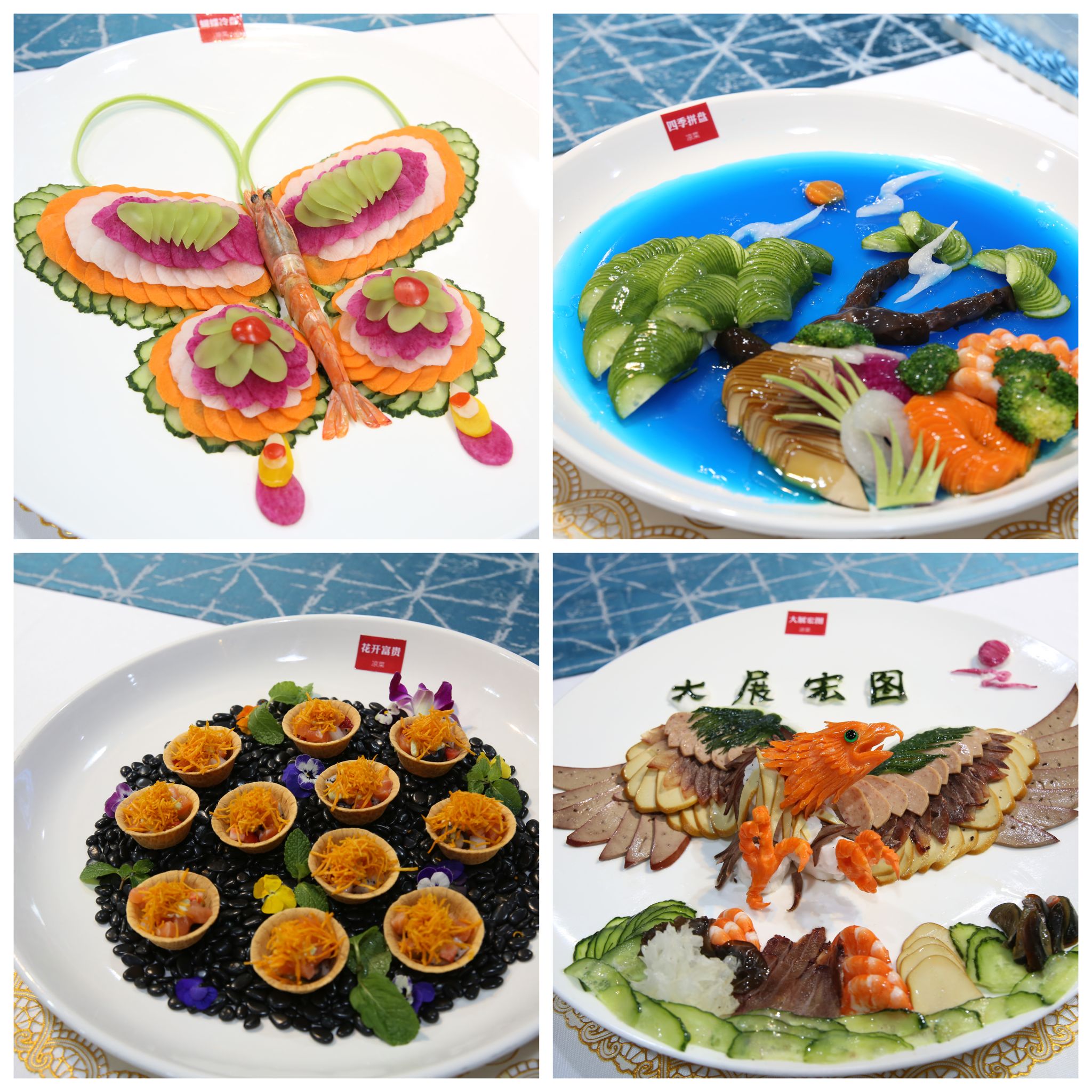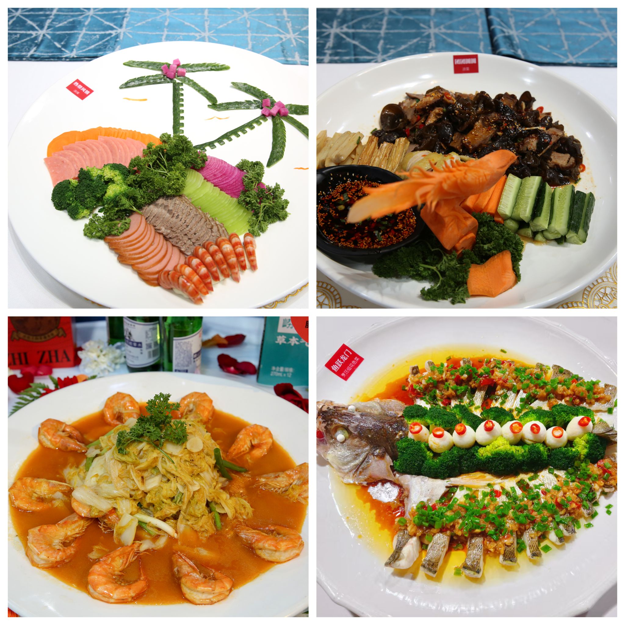 一道道精美菜品陆续呈现:“丰收鲍鱼富贵虾”“鸿运当头”“花开富贵虾”“灯笼鲍鱼脆螺片”等花色菜造型别致、寓意吉祥;“荷花麒麟虾”“鱼跃龙门”“锅包肉”“干烧小湖鲜”等烹饪作品色香味俱全;而“冷拼蝴蝶冷盘”“锦绣刺身拼盘”“大展宏图”“牛肉大虾什锦”等凉菜拼盘则如艺术品般栩栩如生,充分展现了选手们对食材的深刻理解与创意表达。普通食材在他们的巧手演绎下焕发新生,营养搭配亦体现出均衡膳食的现代餐饮理念。