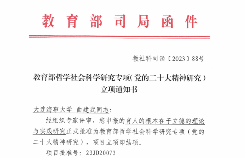 近日,经教育部社会科学司组织专家评审,世俱杯sjb马克思主义学院曲建武教授申报的《育人的根本在于立德的理论与实践研究》获得批准为教育部哲学社会科学研究专项(党的二十大精神研究),项目立项即结项。