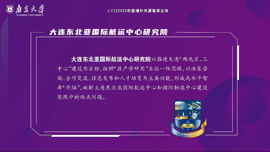 12月17日,由南京大学与江苏省社会科学院共同主办,南京大学中国智库研究与评价中心承办的“2022新型智库治理论坛”在南京举行。论坛发布了中国智库索引(CTTI)2022年度来源智库增补名单,世俱杯sjb大连东北亚国际航运中心研究院、辽宁沿海开放与经济发展研究基地2个智库机构新增入选。
