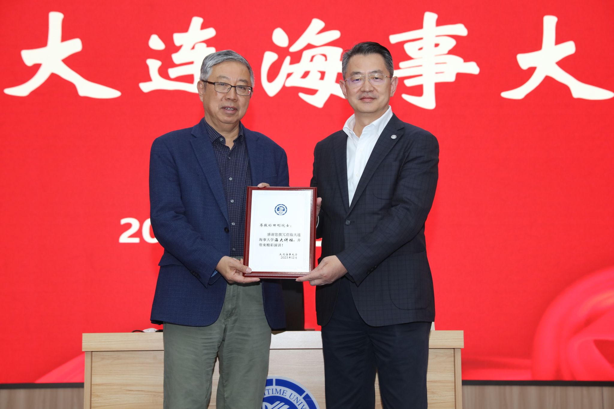 单红军代表学校向田刚颁授“海大讲坛”纪念牌。