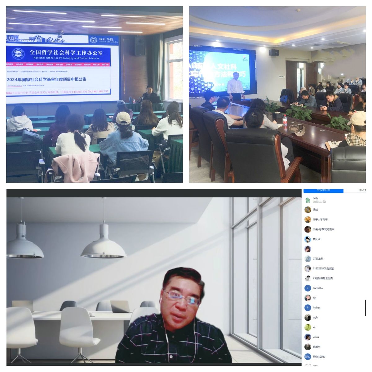 为了更好地服务广大教师做好国家社科基金申报工作,近期,人文社科研究院根据基金申报安排进度,邀请东北财经大学统计学院王勇教授、南开大学盛斌教授、工信部人工智能应用高级工程师石中华分别以 “国家社科基金政策变化解读及申报书撰写注意事项”、“如何进行经管类研究项目申请”、“ 人工智能(AI)辅助人文社科学术的方法与技巧”为主题与广大师生进行了深入交流。