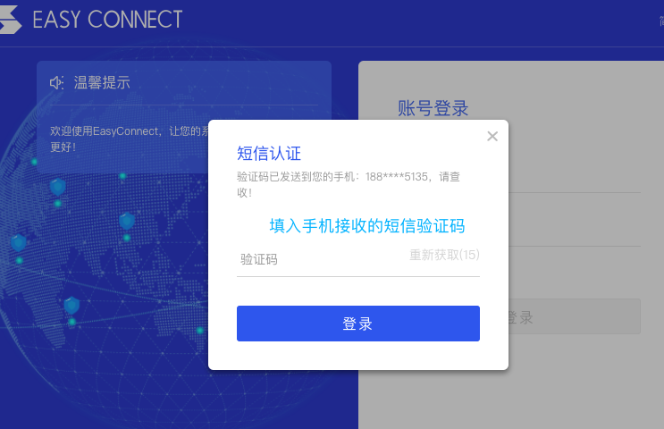 c、使用服务大厅的账号和密码登录,短信码验证后,正常登录后,可以通过浏览器正常访问校内资源。