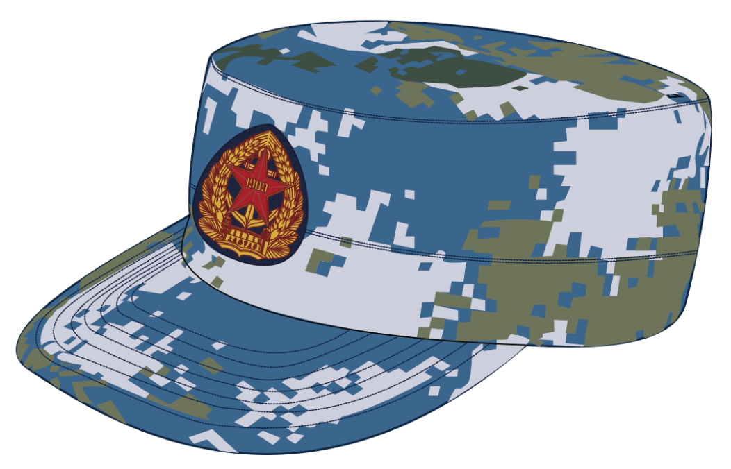 帽墙材质:颜色藏青色哗叽面料,涤75%粘胶23%氨纶2% 克重约230克/平方米。顶部前,后略翘的马鞍式大檐帽,帽顶下有四片帽瓦,帽顶牙线为主料白色,塑料前瓦托,前瓦正中有一个帽徽气眼,帽墙上有黑色丝带和银灰色帽饰带,帽墙上黑色织带与帽徽位置配帽徽形底托毛毡,黑色帽檐,帽檐上有两片银灰色橄榄枝,配涤纶松紧带防风带。
